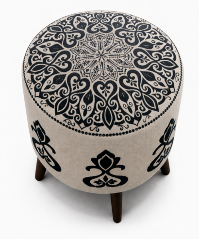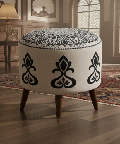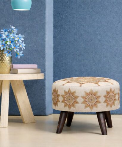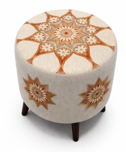 Round Embroidered Wooden Pouffe Stool – Beige & Brown