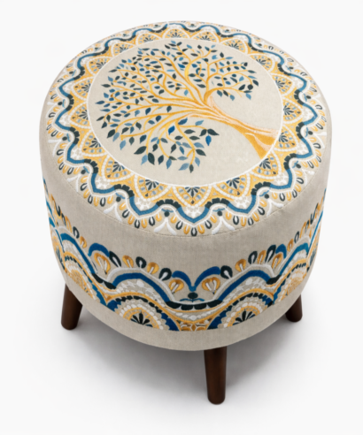 Round Wooden Pouffe Stool with Embroidery Work Fabric