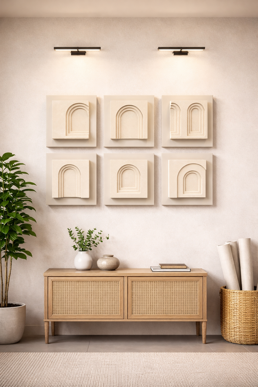 Elegant 12×12 inch modern wall decor set of 6 pieces, featuring a minimal arched design perfect for living room and bedroom walls.
