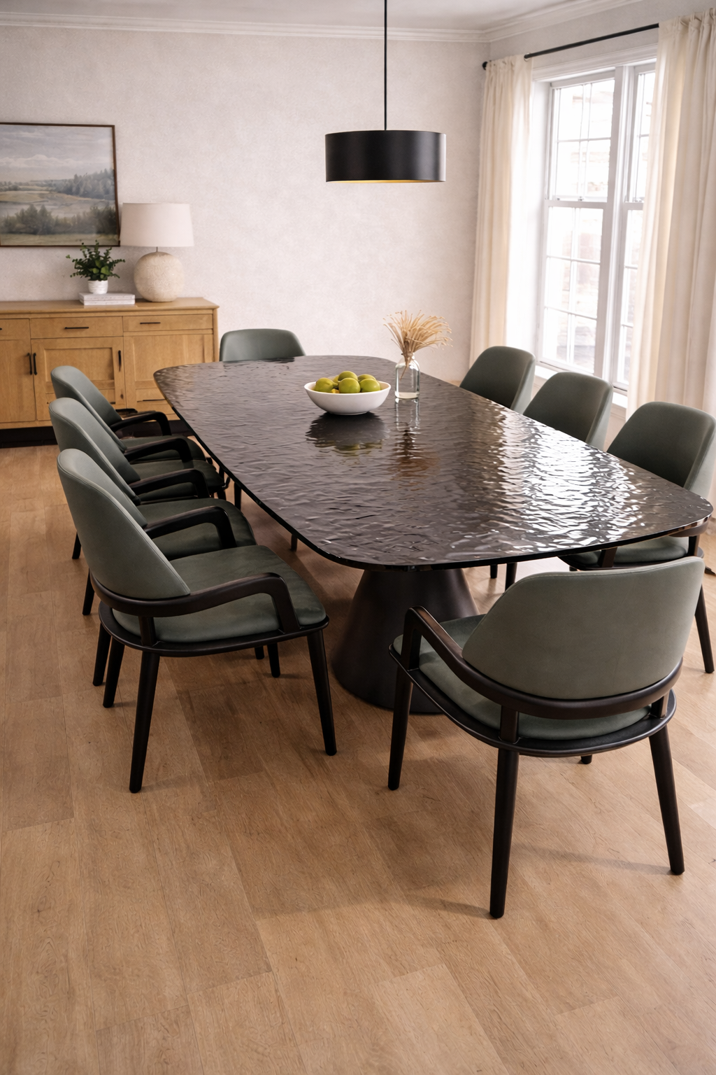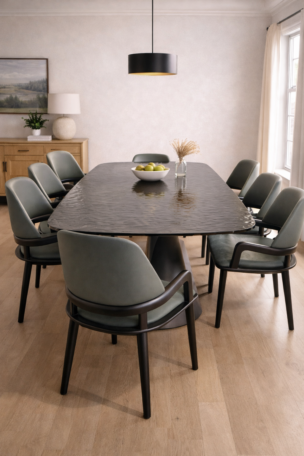 Upgrade your dining space with this 8 seater modern dining table set, featuring a sleek table design and comfortable upholstered chairs for elegant dining.