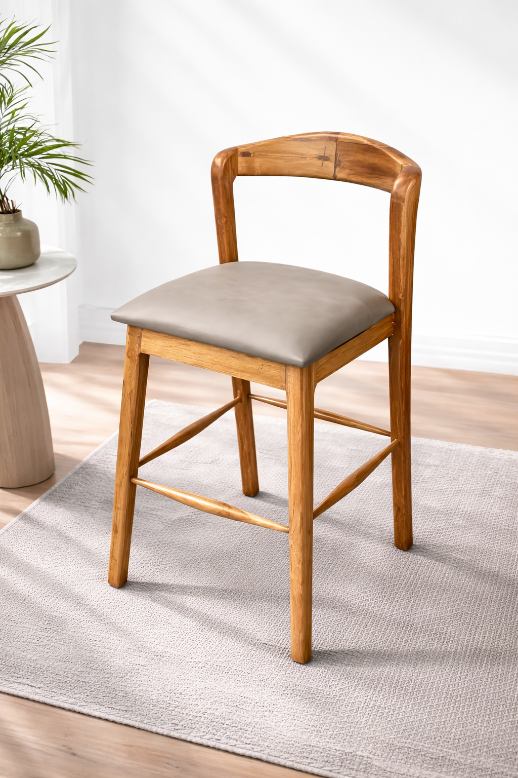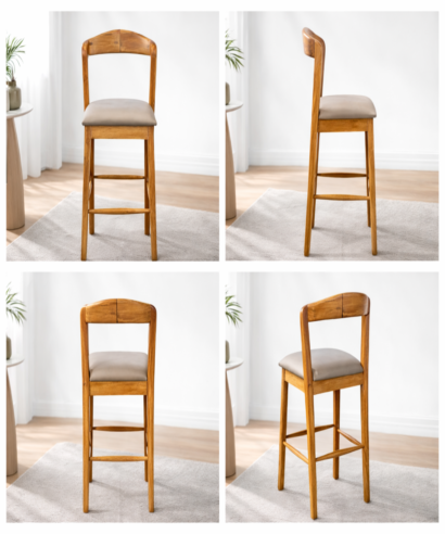 Wooden bar chair with cushioned seat and backrest, designed for kitchen counters, home bars, cafés, and modern indoor spaces.