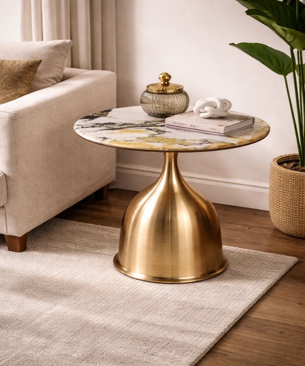 Add timeless luxury to your interiors with this marble top gold corner table, featuring a sculptural metallic base and elegant round tabletop.