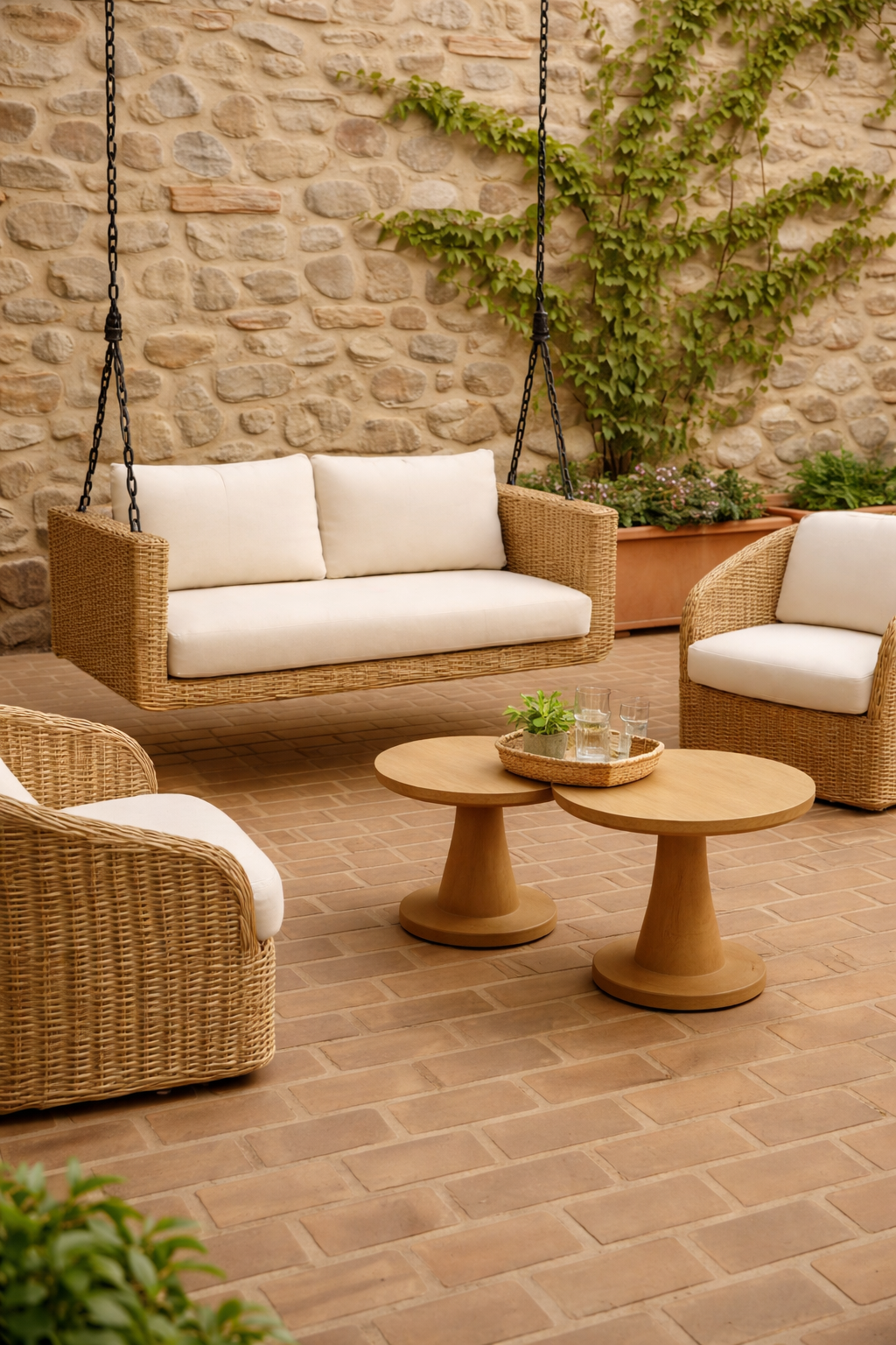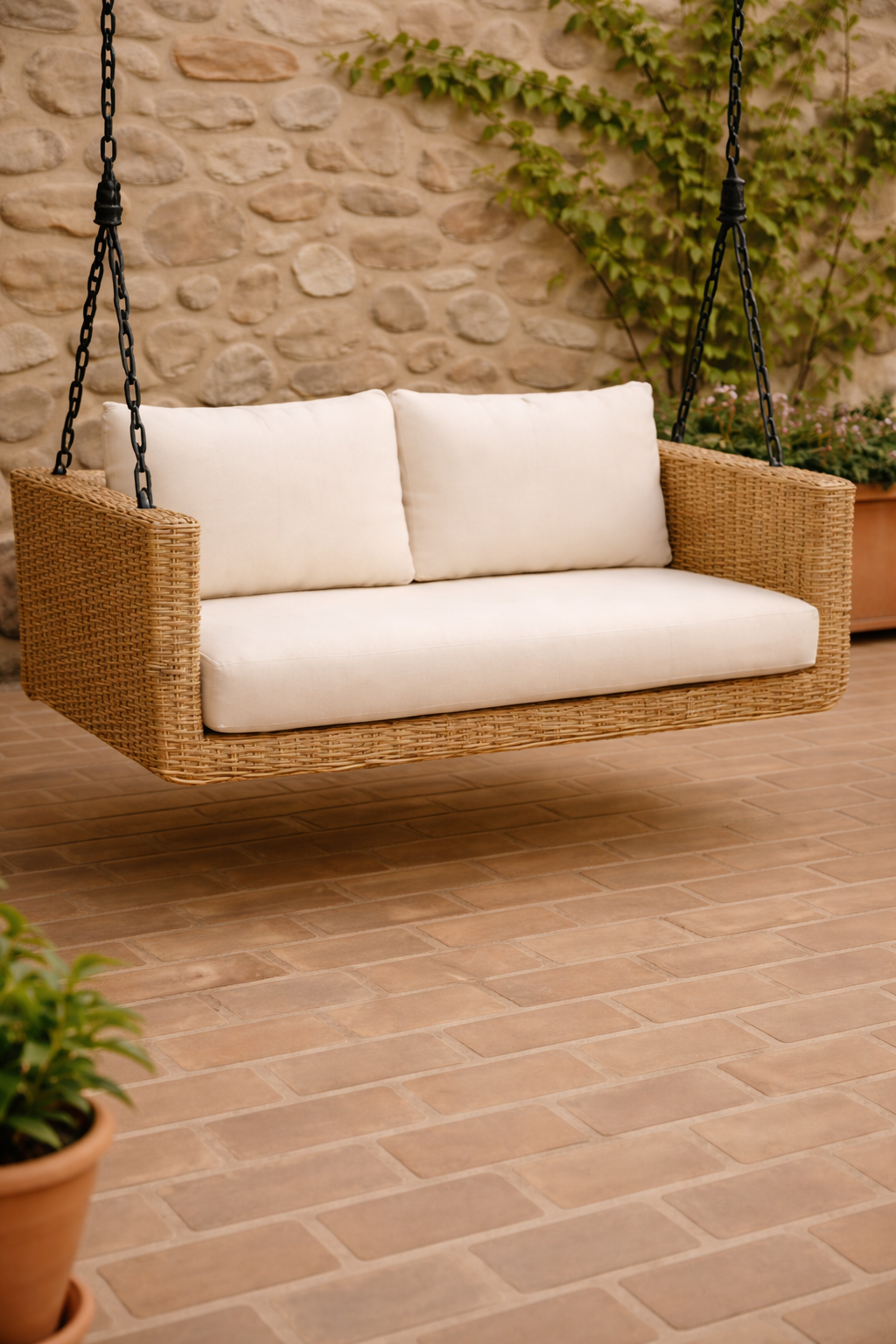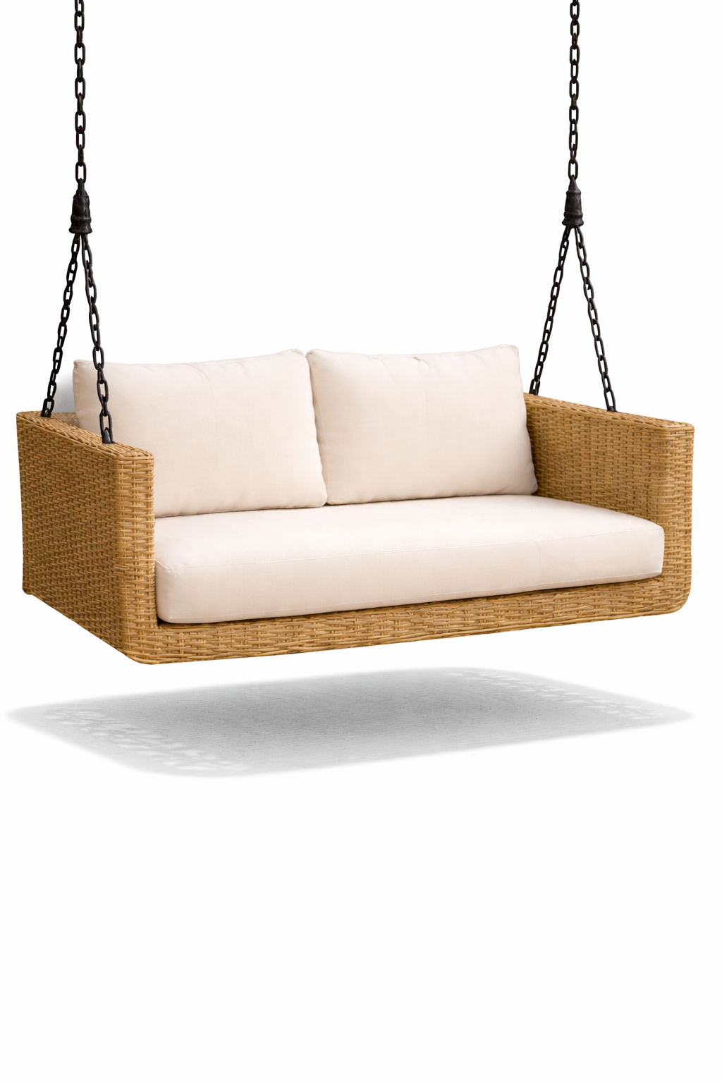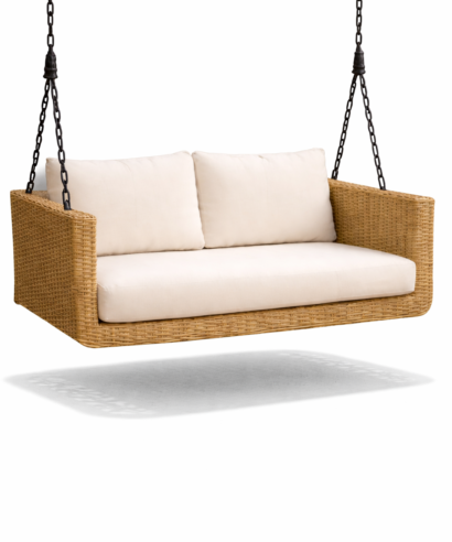 The FSW23 Outdoor Swing Sofa offers comfortable seating with plush cushions and a stylish rattan frame, perfect for relaxing on patios and balconies.