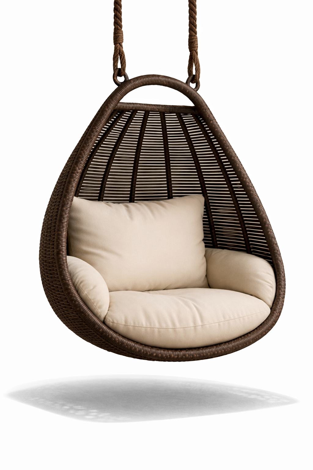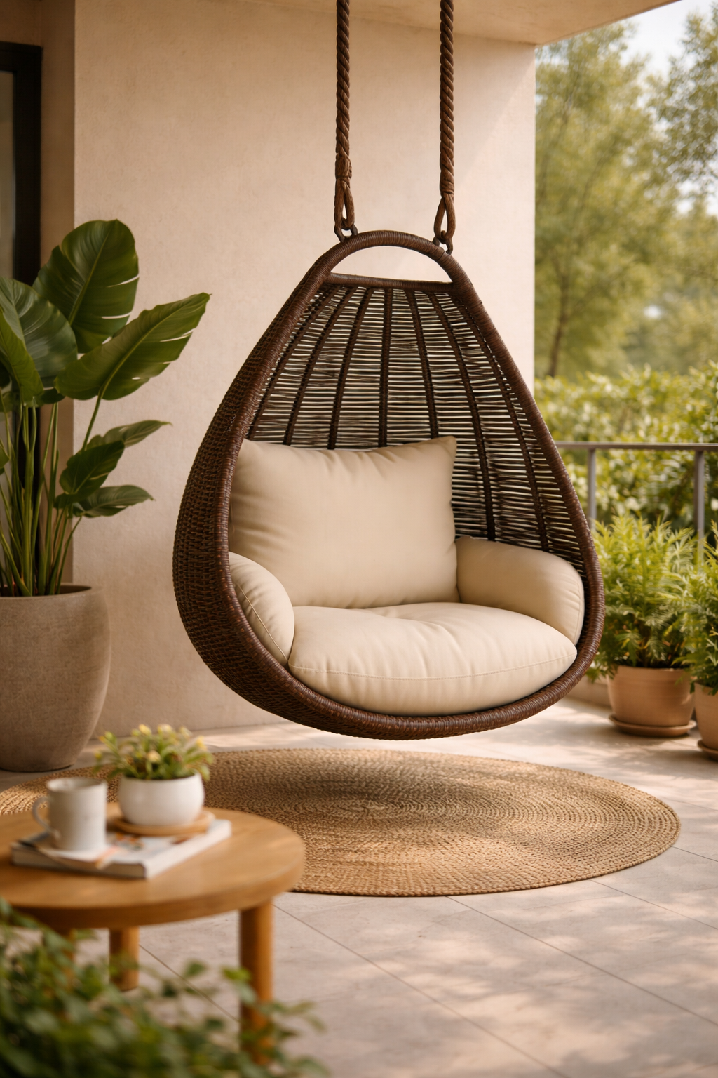 The FSW25 Teardrop Hanging Swing Chair features a stylish rattan design and comfortable cushion, creating a cozy relaxation space for balconies or patios.