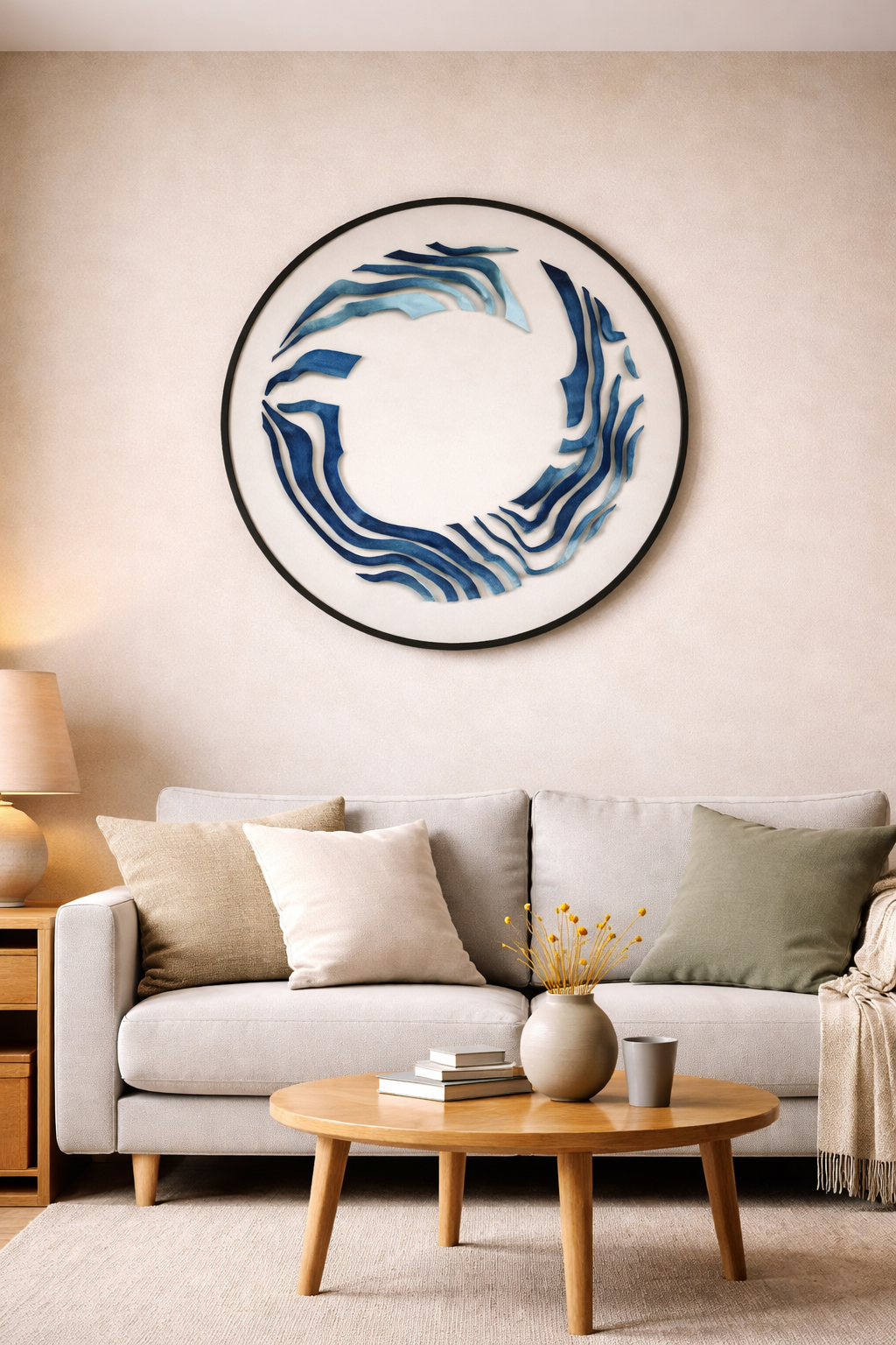 Enhance your space with this modern blue abstract round wall art featuring layered wave patterns inside a sleek circular frame. This contemporary wall décor adds elegance and artistic depth to living rooms, bedrooms, offices, and modern interiors.