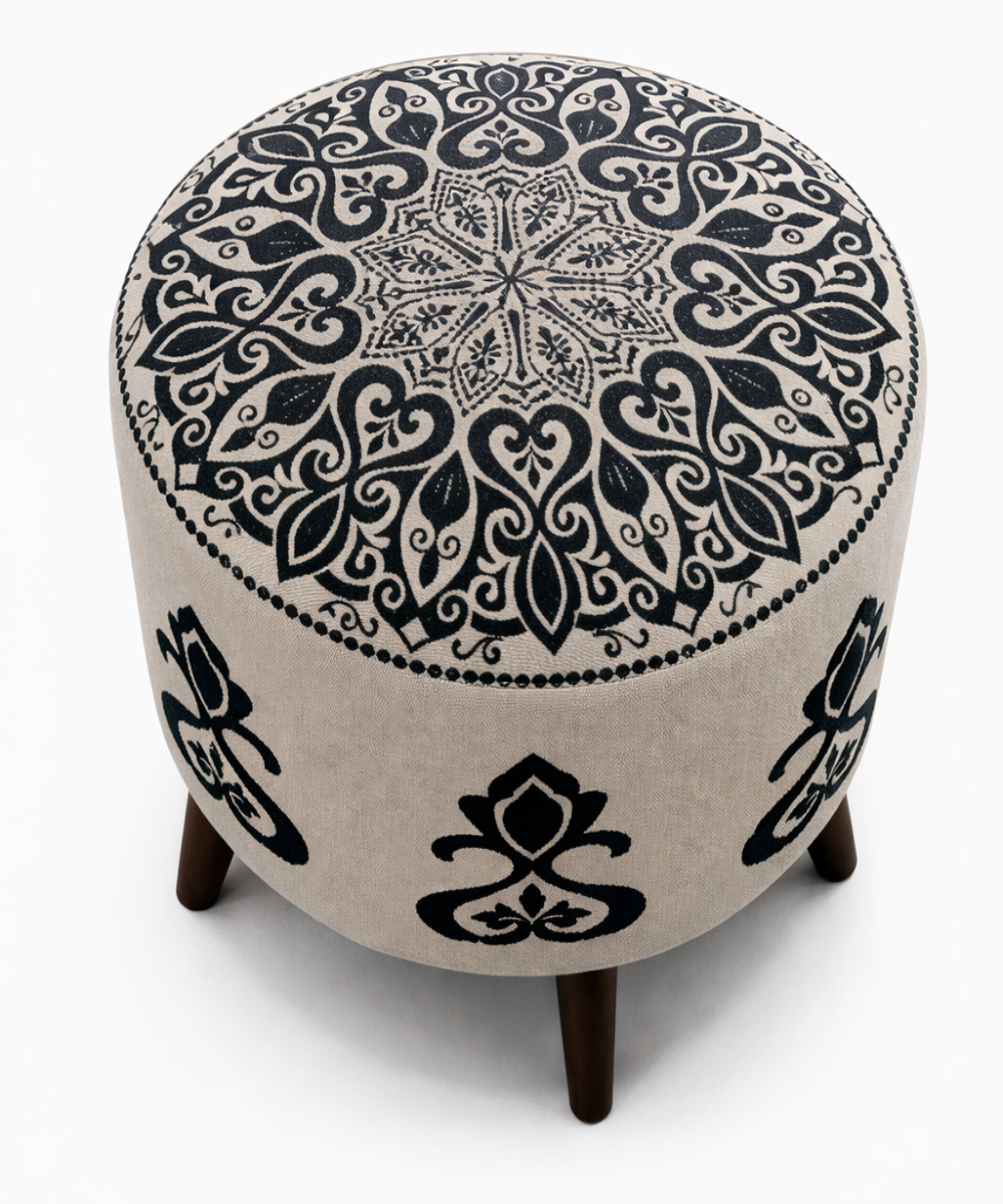 Round embroidered pouffe stool with wooden base and cushioned top, ideal for extra seating, footrest use, and decorative home décor.