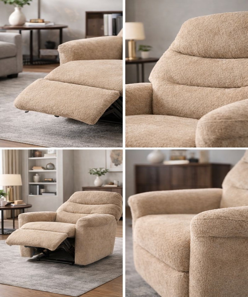 Relax completely with this RRR fabric recliner chair with footrest, featuring plush cushioning, ergonomic back support, and smooth reclining comfort.