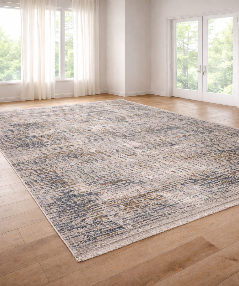 Modern textured grey area rug with a soft low-pile finish, ideal for living rooms and bedrooms, adding comfort and a clean contemporary look.