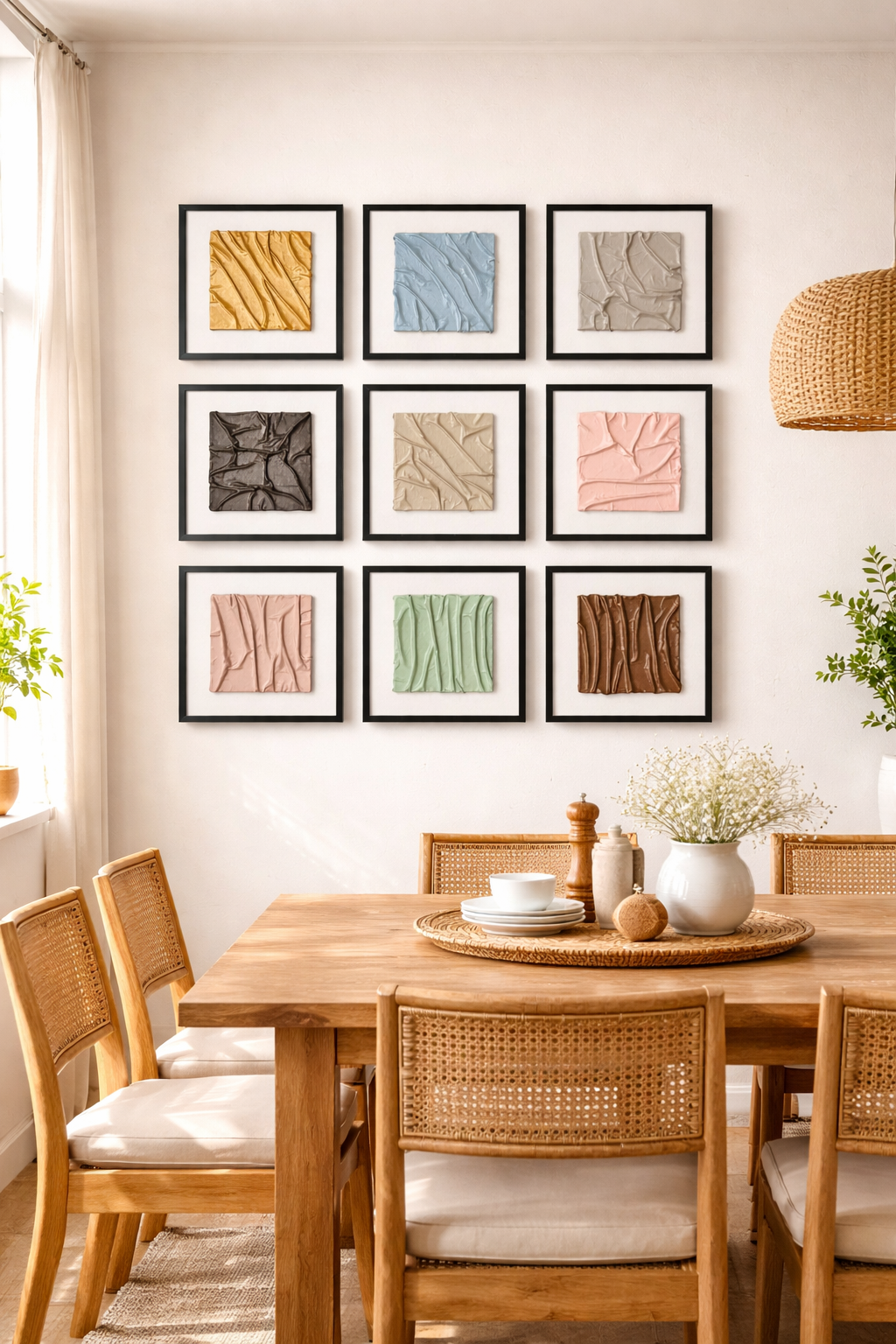 Stylish abstract framed wall decor set of 9 pieces, featuring textured modern art panels ideal for living room and contemporary home interiors.