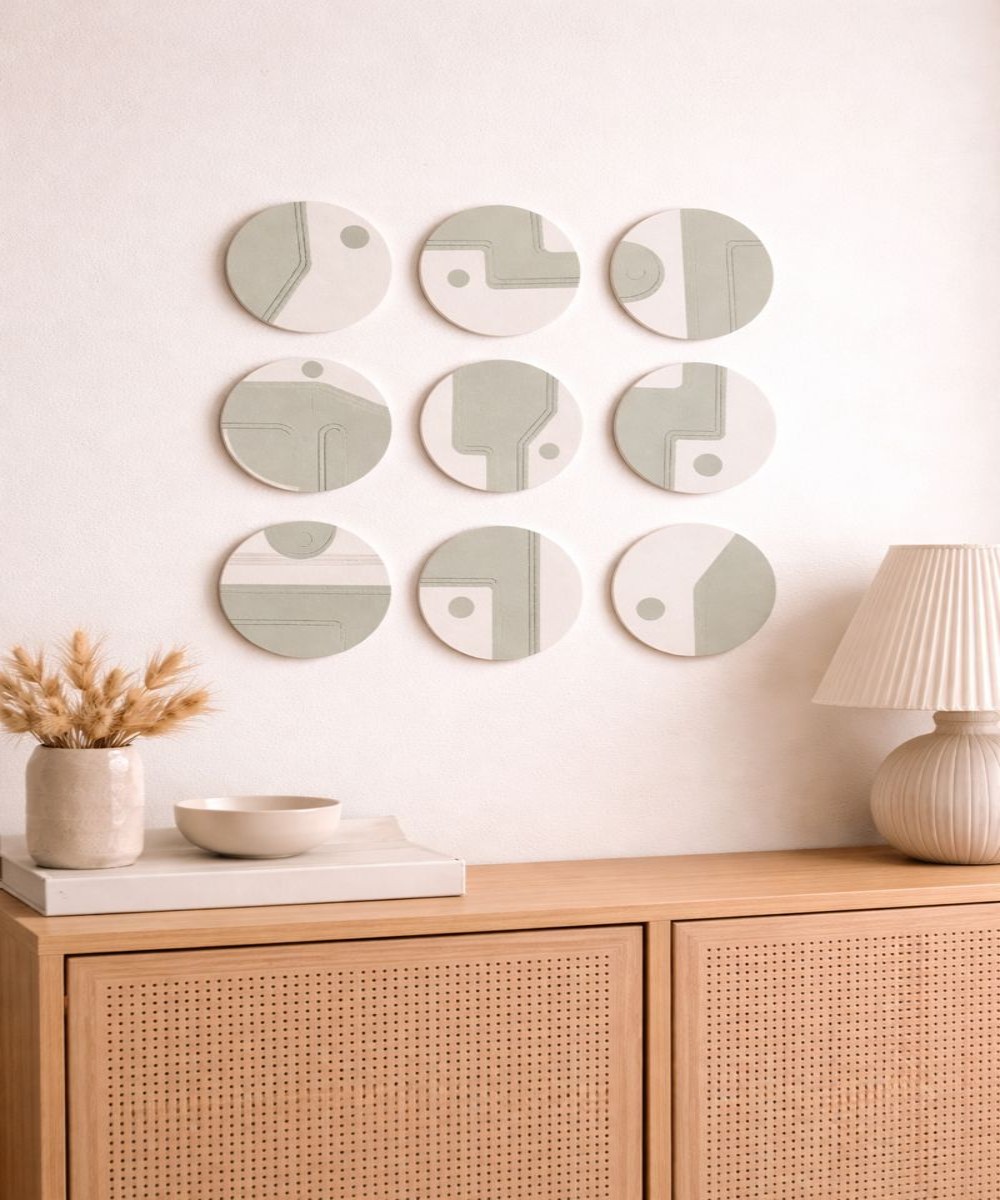Elegant round wall decor set of 9 pieces with a soft modern design, perfect for living room walls and minimal home interiors.